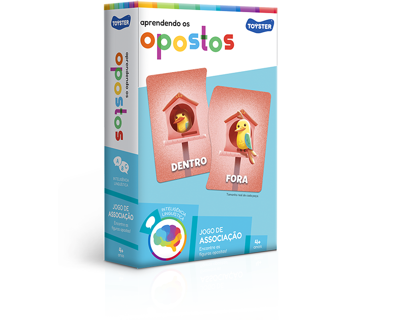 Encaixando as peças, a criança se diverte enquanto aprende a associar figuras opostas. Esse jogo auxilia no desenvolvimento de inteligência linguística.